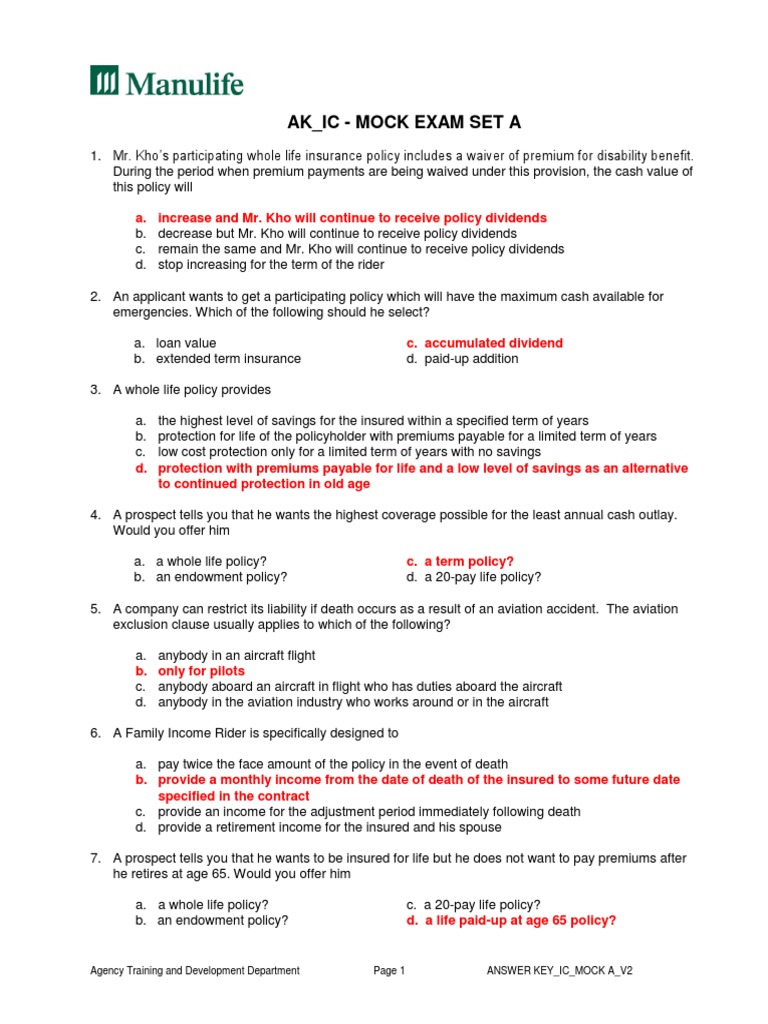 Answer Key Ic Mock Exam Set A Pdf Pdf Life Insurance Insurance